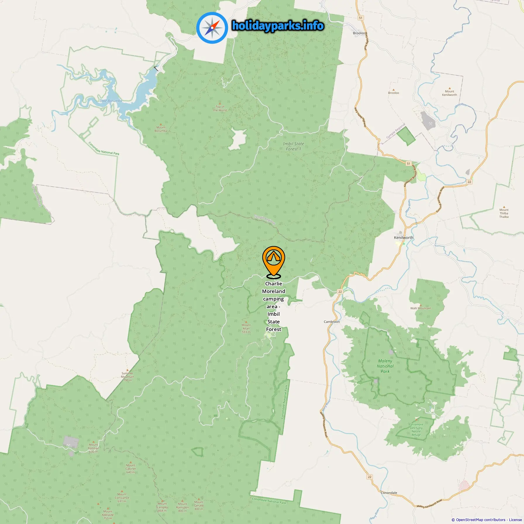 Location of Charlie Moreland camping area - Imbil State Forest